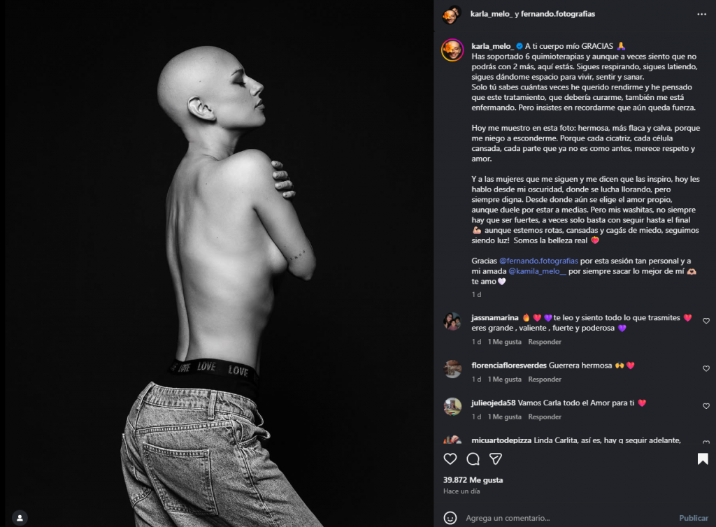 “Cada cicatriz, cada célula cansada, cada parte que ya no es como antes, merece respeto y amor”, agregó Karla Melo, reafirmando su compromiso con el amor propio.