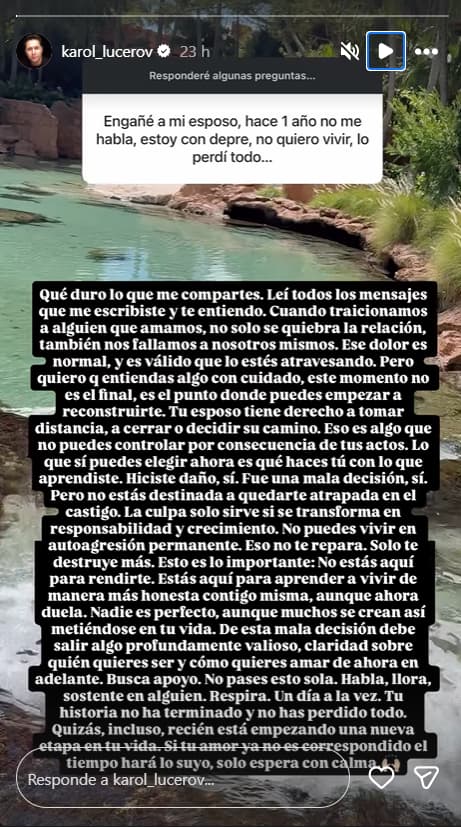 La mujer le confesó: “Engañé a mi esposo hace un año, no me habla, estoy con depre. No quiero vivir, lo perdí todo“. Lejos de evitar un tema tan espinoso para su propia historia, Karol Lucero decidió enfrentarlo con una madurez que sorprendió a sus seguidores.