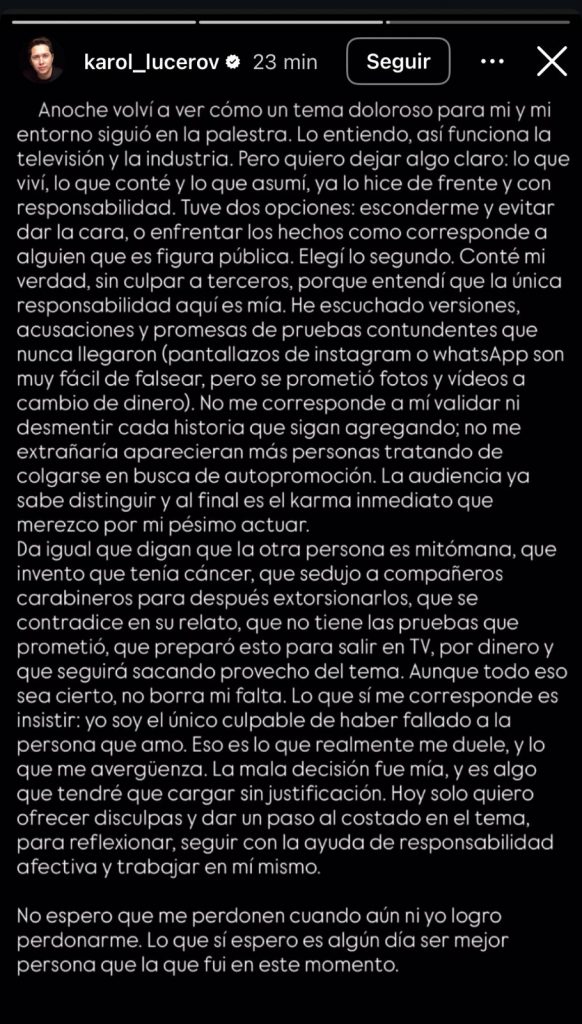 En un extenso comunicado publicado en sus historias, el ex rostro de televisión reconoció que el tema ha sido “doloroso” tanto para él como para su entorno, pero enfatizó que decidió enfrentarlo “de frente y con responsabilidad”. “Tuve dos opciones: esconderme y evitar dar la cara, o enfrentar los hechos como corresponde a alguien que es figura pública. Elegí lo segundo. Conté mi verdad, sin culpar a terceros, porque entendí que la única responsabilidad aquí es mía”, señaló.