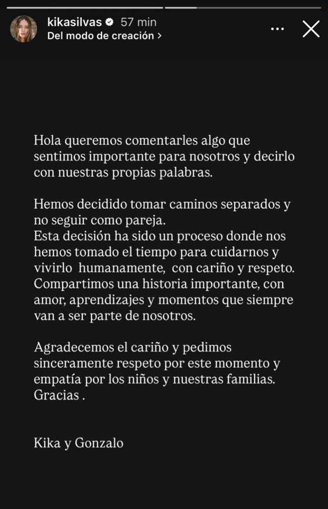 Con este comunicado, Kika Silva puso fin a las especulaciones y entregó su versión directa sobre el término de la relación, marcando así el cierre de una etapa importante en la vida de ambos.