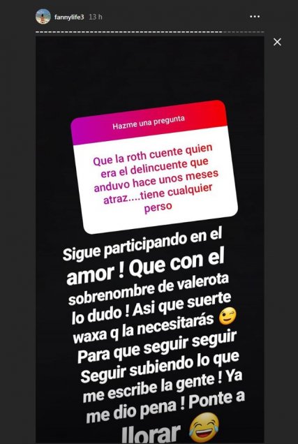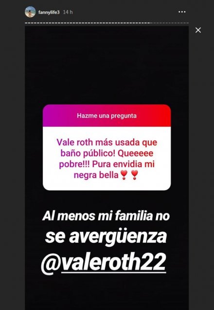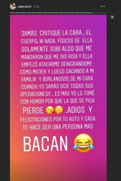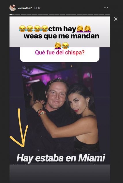 Cuevas respondió en con una fotografía de él y, además, escribió “Hay estábamos en Miami”. Valentina Roth no tuvo piedad y se burló de su falta ortográfica públicamente. Luego la otra respondió, y así se generó una pelea virtual.