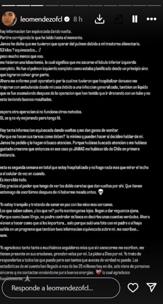 El influencer chileno finalizó su mensaje reiterando que, aunque la recuperación ha sido difícil, mantiene la esperanza de superar este nuevo desafío.