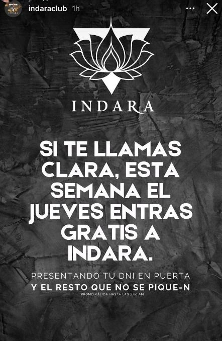 “Si te llamas Clara, esta semana, el jueves entras gratis“, anunciaron a través de las redes sociales de la discoteca Indara, aludiendo a Clara Chía.