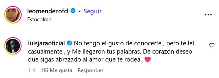“No tengo el gusto de conocerte, pero te leí casualmente y me llegaron tus palabras”, comenzó escribiendo el artista, en una frase que generó diversas reacciones positivas entre los seguidores del joven.