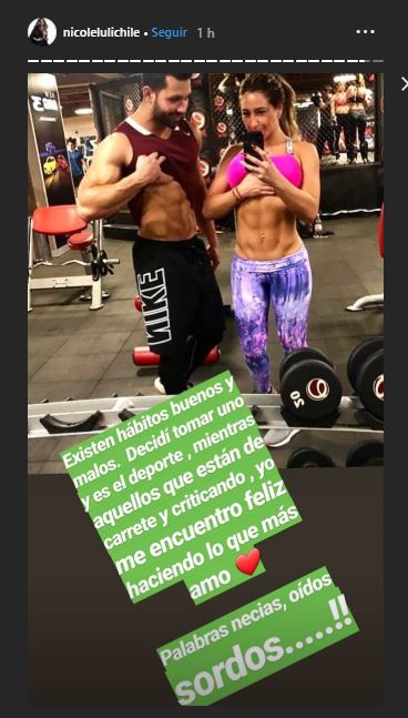 “Existen hábitos buenos y malos. Decidí tomar uno y es el deporte, mientras aquellos que están de carrete y criticando, yo me encuentro feliz haciendo lo que más amo“, sentenció para luego lanzar la frase “Palabras necias, oídos sordos”.