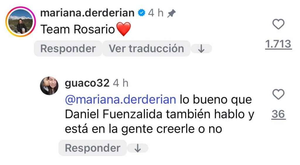 Una de las más comentadas fue la actriz Mariana Derderián, quien dejó un mensaje claro en una publicación: “Team Rosario”, acompañado de un corazón.