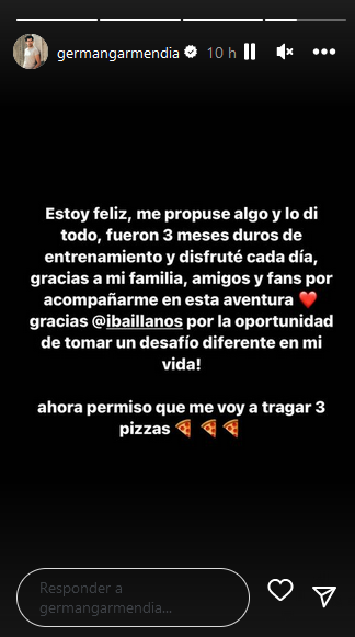 “Estoy feliz, me propuse algo y lo di todo, fueron 3 meses de duro entrenamiento y disfruté cada día, gracias a mi familia, amigos y fans por acompañarme en esta aventura”, fue el mensaje compartido por Garmendia en historias de Instagram.