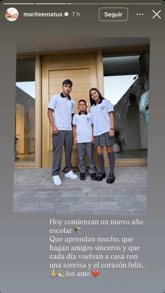 “Hoy comienzan un nuevo año escolar. Que aprendan mucho, que hagan amigos sinceros y que cada día vuelvan a casa con una sonrisa y el corazón feliz… los amo”, escribió junto al registro.