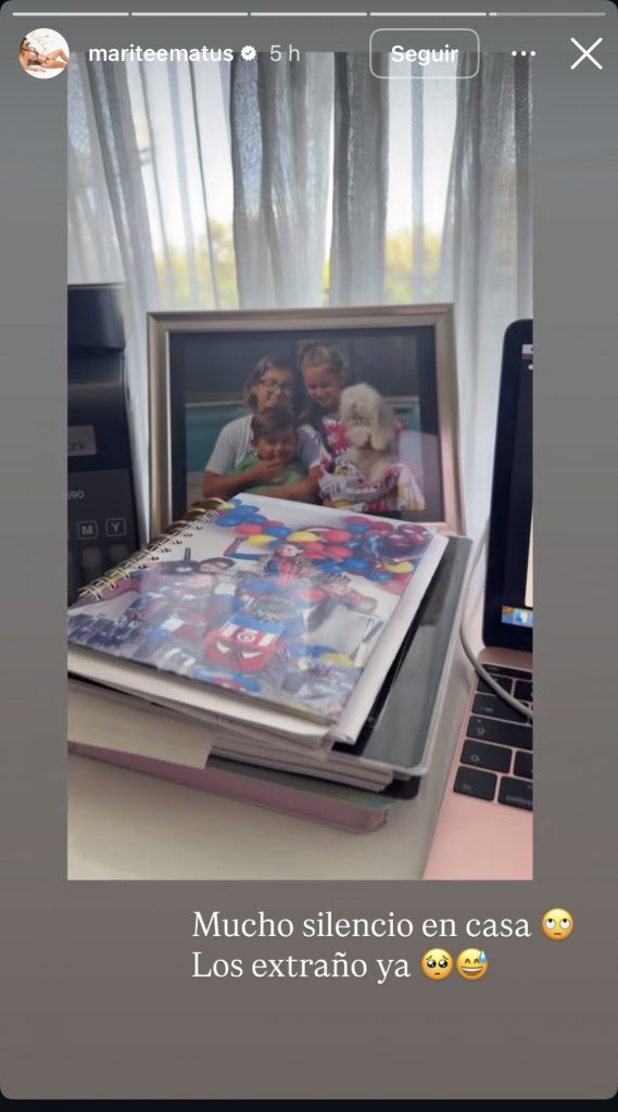 Más tarde, Matus volvió a publicar contenido relacionado con el mismo momento, esta vez mostrando un cuadro con una fotografía de sus hijos. En la historia, la empresaria comentó que la casa se había quedado con “mucho silencio”, agregando: “Los extraño ya”.