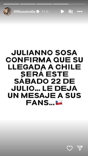 Ahora, en un comunicado compartido por la cuenta del artista, se confirmó su regreso a Chile: “Cesar Martínez Pozo AKA Julianno Sosa volverá a Chile esta semana tras sufrir la misma opresión y el mismo destino de muchos inmigrantes a manos del gobierno de Estados Unidos… Las preparaciones para su llegada ya están en marcha“, confirmando además que arribará al país el próximo 22 de julio.