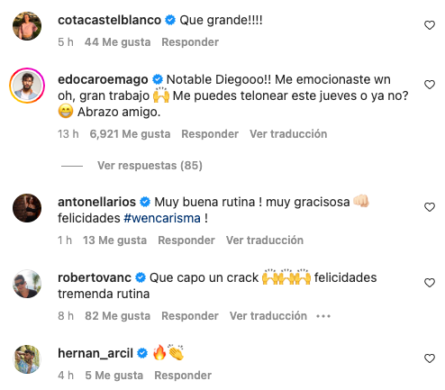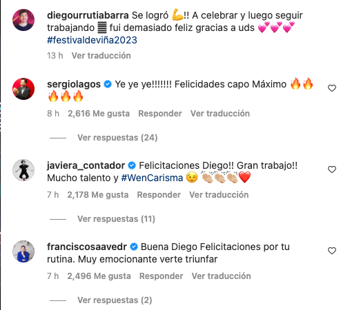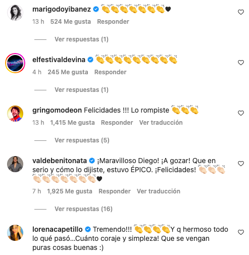 “Felicidades capo máximo”, expresó Sergio Lagos en la publicación. En tanto, “Pancho” Saavedra manifestó lo siguiente: “Buena Diego. Felicitaciones por tu rutina. Muy emocionante verte triunfar”.