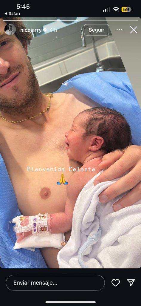 La pareja compartió la noticia con sus seguidores a través de Instagram. Laura Urruticoechea publicó en sus historias: “Ayer recibimos a nuestra Celeste”, acompañando el mensaje con una imagen en la que se aprecia a la bebé de espaldas. Por su parte, Nicolás Jarry también compartió una fotografía muy tierna, sosteniendo a su hija en brazos, junto a la leyenda: “Bienvenida Celeste”, acompañada de un emoji que refleja gratitud y felicidad.