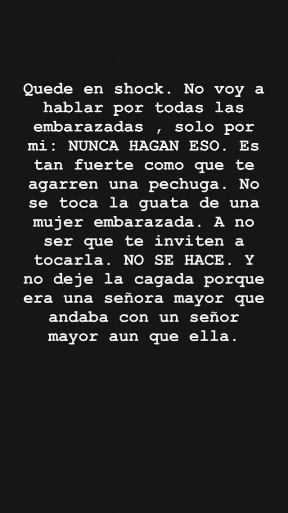 “NUNCA HAGAN ESO, es tan fuerte como que te agarren una pechuga. No se toca la guata de una mujer embarazada, a no ser que te inviten a tocarla. NO SE HACE“, enfatizó.