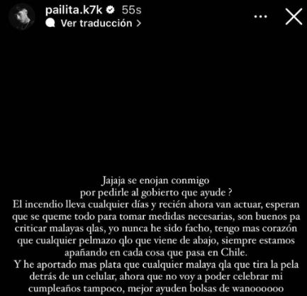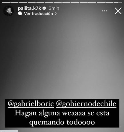 Por medio de sus historias en su cuenta de Instagram el popular cantante manifestó: “Hagan alguna weá, se está quemando todo (…) Muevan la raja mierdaaa”, etiquetando en la publicación al Presidente Gabriel Boric y al Gobierno de Chile.