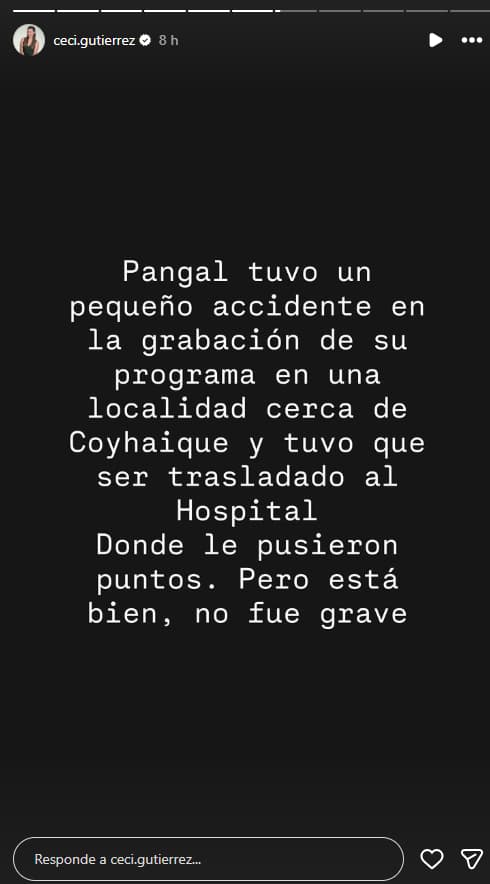 “Pangal tuvo un pequeño accidente en la grabación de su programa en una localidad cerca de Coyhaique y tuvo que ser trasladado al hospital donde le pusieron puntos. Pero está bien, no fue grave”, explicó Cecilia Gutiérrez.