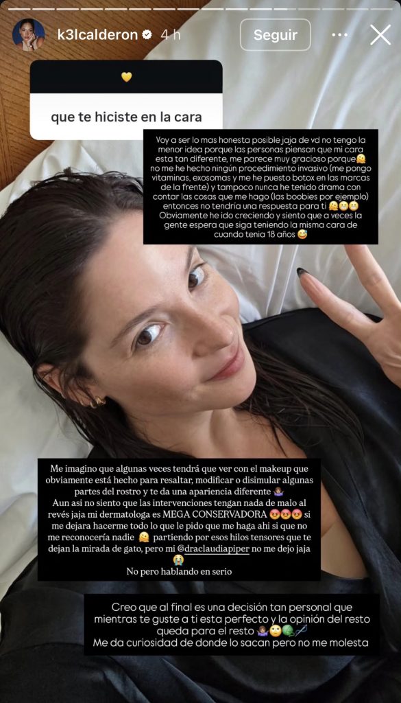 La influencer también negó los rumores sobre los hilos tensores, explicando que su dermatóloga es “mega conservadora” y no permite cambios drásticos en su rostro. Recordó además que siempre ha sido transparente con los procedimientos que sí se ha realizado, como sus cirugías de busto.