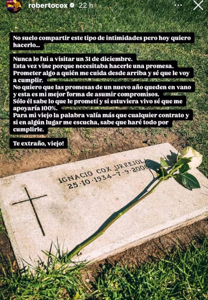 Cox también reflexionó sobre los valores que su padre le inculcó en vida. “Para mi viejo, la palabra valía más que cualquier contrato y si en algún lugar me escucha, sabe que haré todo por cumplirle. ¡Te extraño, viejo!”, escribió, cerrando con un emotivo homenaje.