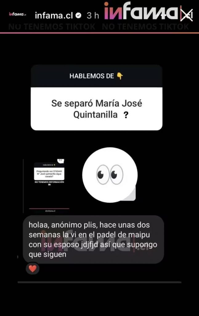 Todo comenzó cuando el portal Infama recibió una consulta directa sobre el estado sentimental de la cantante: “¿María José Quintanilla sigue casada?”, preguntaron en redes.