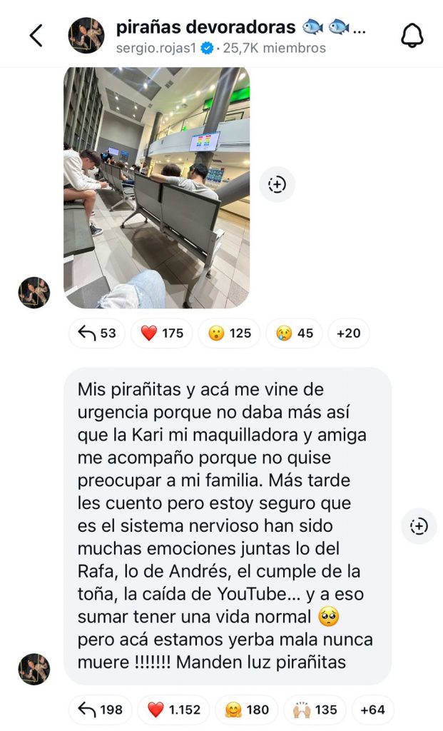 Hasta el momento, Sergio Rojas no ha entregado mayores detalles sobre su diagnóstico, aunque aseguró que se encuentra en observación médica y agradeció el apoyo recibido por parte de quienes siguen su trabajo.