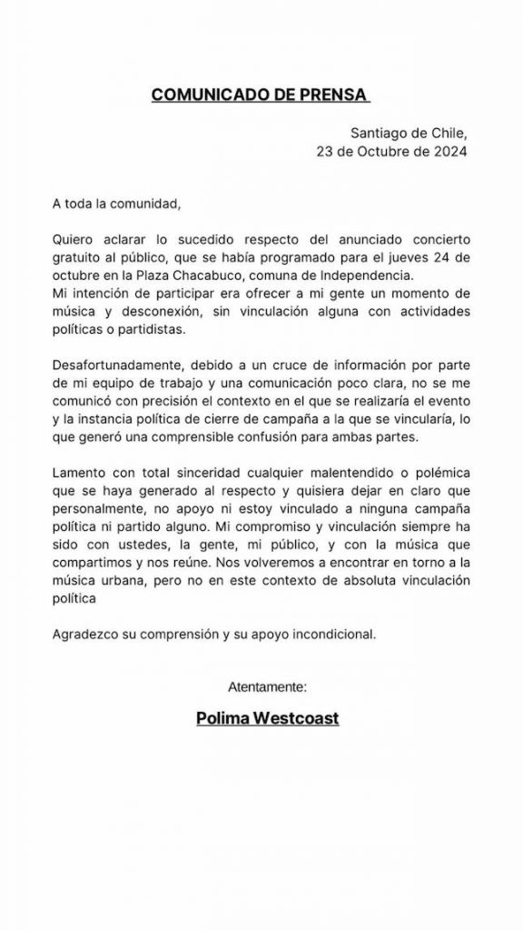 Polimá también aprovechó el comunicado para reafirmar que no apoya ni está vinculado a ningún partido político, reiterando que su compromiso es siempre con su público y la música que comparten.