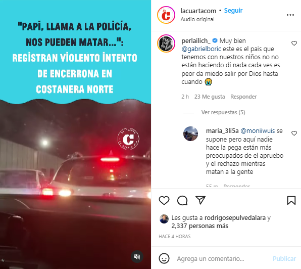 Otras de las que comentó la publicación fue la exchica reality Perla Ilich, quien se unió a las críticas contra el Presidente, reclamando por la falta de seguridad: “Muy bien @gabrielboric este es el país que tenemos con nuestros niños. No están haciendo nada, cada vez es peor. Da miedo salir, por Dios hasta cuándo“, redactó.