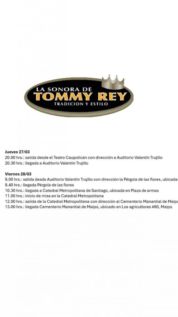 Tras la ceremonia religiosa, el cortejo se dirigirá hasta el Cementerio Manantial de Maipú. Allí se llevará a cabo el último adiós al histórico líder de la Sonora de Tommy Rey.