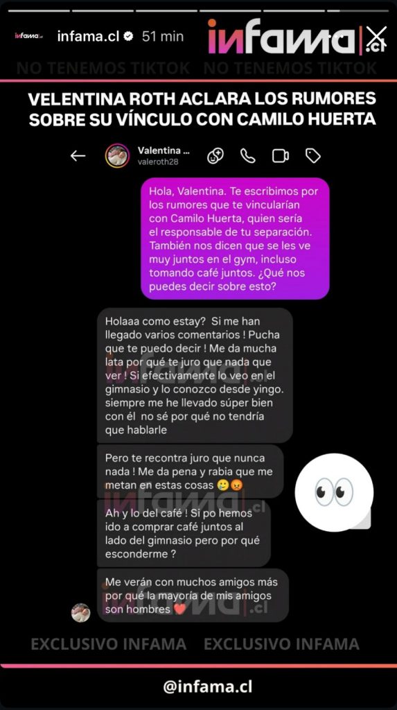 En ese contexto resurgieron las especulaciones que apuntaban a un presunto vínculo entre Roth y Camilo Huerta, quien también atraviesa un quiebre mediático tras su separación de Marité Matus. Ante estas versiones, el sitio Infama contactó directamente a la ex integrante de Yingo, quien desmintió tajantemente cualquier relación más allá de una amistad.
