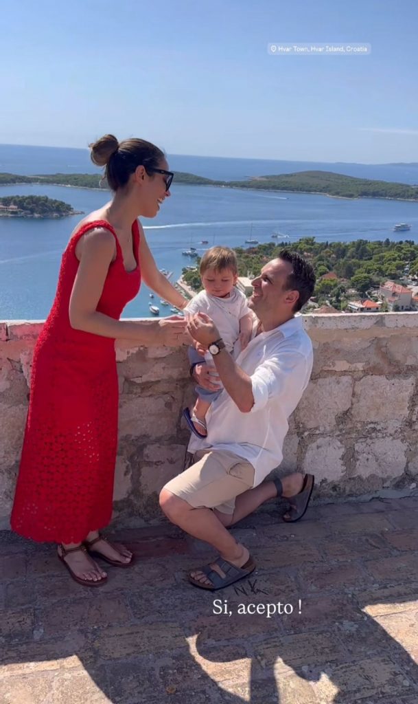 Durante sus vacaciones, Carlos Garcés sorprendió a Borghi con una romántica propuesta. En un video compartido en sus stories de Instagram, la modelo mostró cómo su pareja, con su hijo en brazos, se arrodilló y sacó el anillo. Borghi respondió: “Sí, acepto”.
