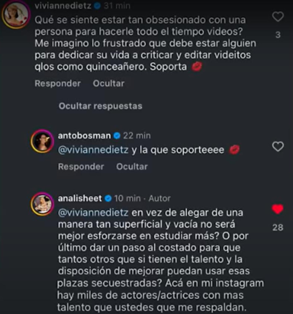 Posteriormente, el crítico subió un nuevo video en YouTube reafirmando sus dichos, mientras que Vivianne Dietz borró sus comentarios de Instagram. La actriz recibió el respaldo de su colega Antonia Bosman, quien también comentó la publicación original.