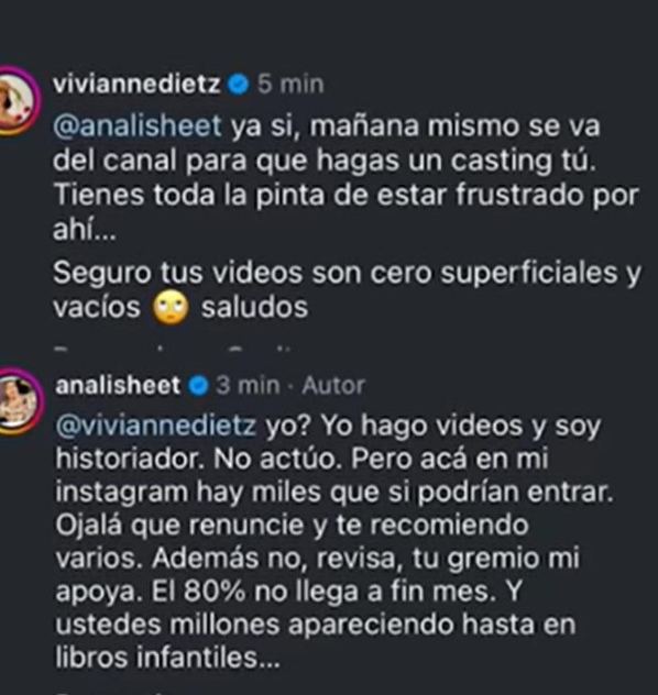 Von Gierke cerró la discusión con un último comentario donde insistió en sus críticas: “Yo hago videos y soy historiador. No actúo. Pero acá en mi Instagram hay miles que sí podrían entrar. Ojalá que renuncie y te recomiendo varios. Además no, revisa, tu gremio me apoya. El 80% no llega a fin de mes. Y ustedes millones apareciendo hasta en libros infantiles”, remató el creador de contenido.
