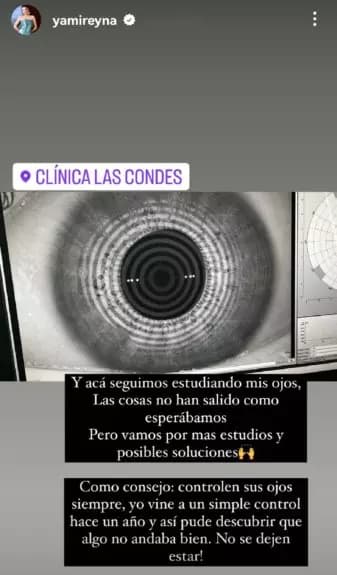 Con una foto del escáner que le realizaron en la clínica, Reyna detalló: “Y acá seguimos estudiando mis ojos. Las cosas no han salido como esperábamos, pero vamos por más estudios y posibles soluciones“.