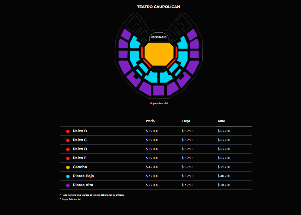 En cuanto a los precios, estos van $28.750 en Platea Alta hasta $63.250 en Palco B, y se detallan de la siguiente manera: