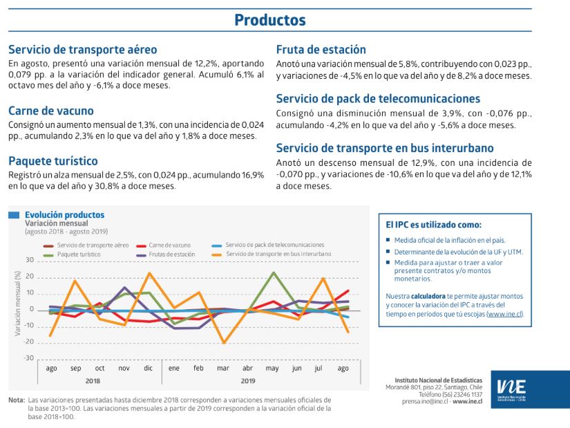 Entre los productos subieron y que destacó el INE está el servicio de transporte aéreo (12,2%), las frutas de estación (5,8%), carne de vacuno (1,3%) y el paquete turístico (2,5%).