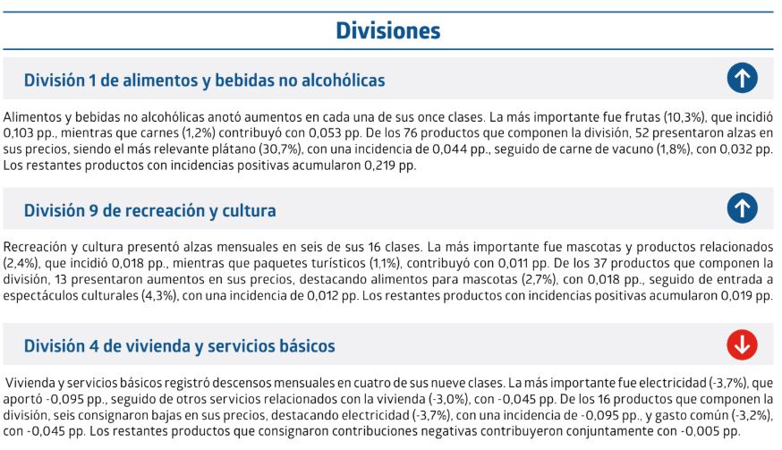 Entre las divisiones con alzas en sus precios destacó alimentos y bebidas no alcohólicas (1,3%), con 0,249 puntos porcentuales (pp.), y recreación y cultura (0,5%), con 0,034 pp. Las restantes divisiones que influyeron positivamente contribuyeron con 0,032 pp. en conjunto.