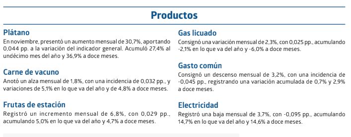 “En el undécimo mes del año, cuatro de las doce divisiones que conforman la canasta del IPC aportaron incidencias positivas en la variación mensual del índice, siete presentaron incidencias negativas y una registró nula incidencia”, detalló el instituto.