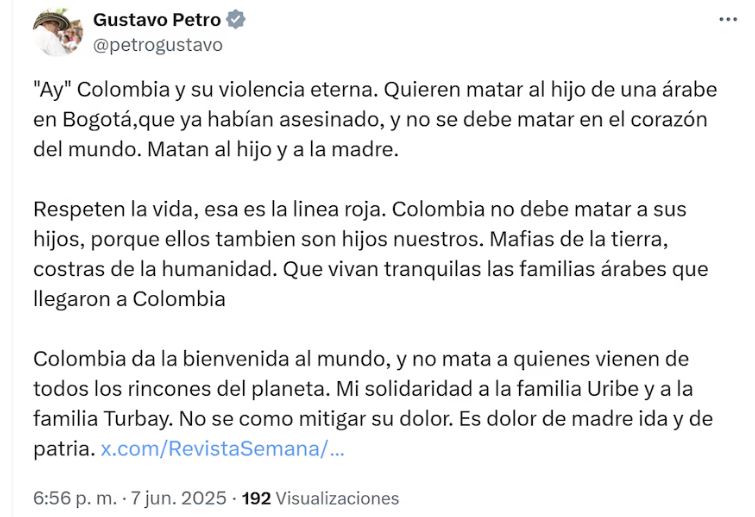 “¡Ay, Colombia y su violencia eterna! Quieren matar al hijo de una árabe en Bogotá, que ya habían asesinado, y no se debe matar en el corazón del mundo. Matan al hijo y a la madre. Respeten la vida, esa es la línea roja”, escribió el jefe de Estado, condenando los hechos.