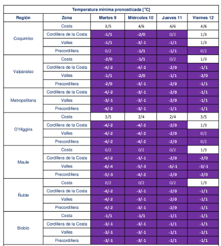 Las mínimas alcanzarían incluso los -6 °C en valles del Maule, por lo que el llamado es a tomar las debidas precauciones.