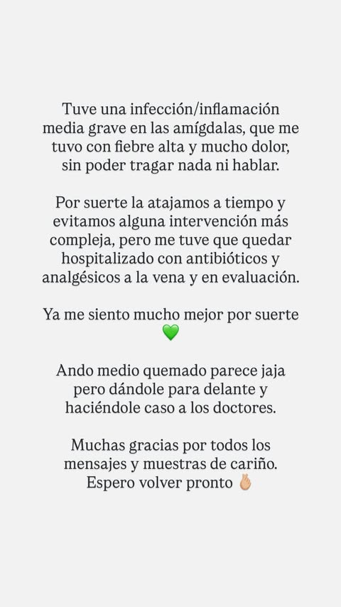 Posteriormente, el alcalde entregó más detalles sobre su diagnóstico. Indicó que enfrenta “una infección/inflamación media grave en las amígdalas”, lo que requirió un tratamiento inmediato con antibióticos y analgésicos intravenosos para evitar complicaciones mayores. Al respecto, afirmó: “Por suerte la atajamos a tiempo y evitamos alguna intervención más compleja”.