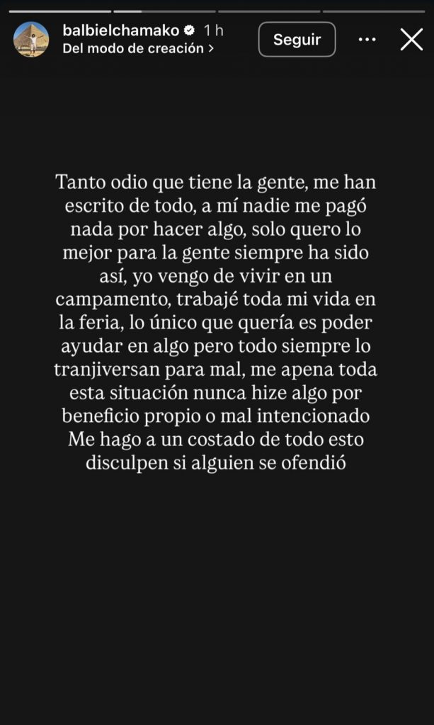 “Tanto odio que tiene la gente. Me han escrito de todo. A mí nadie me pagó nada por hacer algo, solo quiero lo mejor para la gente, siempre ha sido así”, escribió en una historia, dejando en evidencia que el episodio le afectó profundamente.