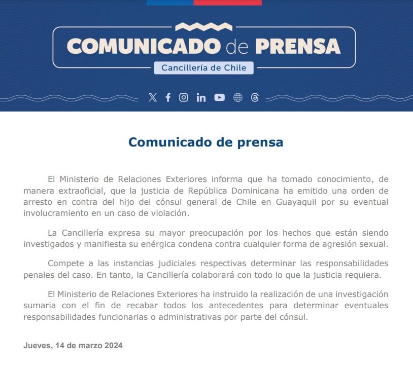 “El Ministerio de Relaciones Exteriores informa que ha tomado conocimiento, de manera extraoficial, que la justicia de República Dominicana ha emitido una orden de arresto en contra del hijo del cónsul general de Chile en Guayaquil por su eventual involucramiento en un caso de violación”, comienza el texto.