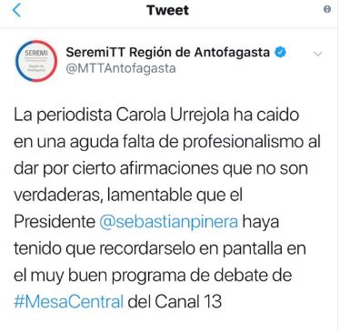 Sin embargo, desde la Seremi de Transportes de Antofagasta criticaron a la periosdista a través de su cuenta de Twitter oficial, para luego borrar el tweet.
