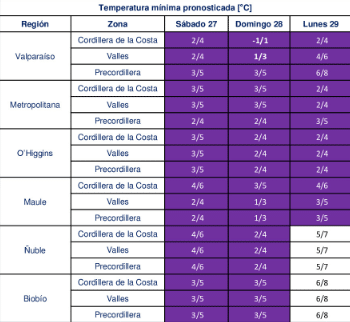 “La presencia de un anticiclón frío, en conjunto con noches despejadas y vientos débiles durante la madrugada” favorecerán la presencia del evento, que se detalla con las siguientes temperaturas: