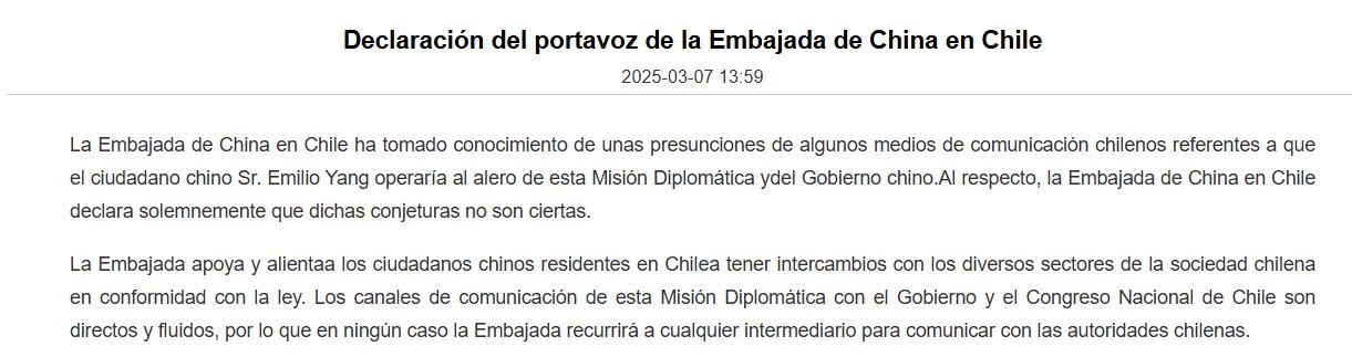 El caso ha generado gran controversia debido a los supuestos favores que Yang habría realizado y cobrado tanto a la parlamentaria como al Municipio de Santiago. En ese contexto, la misión diplomática china emitió un comunicado en el que rechaza categóricamente cualquier nexo con el empresario.
