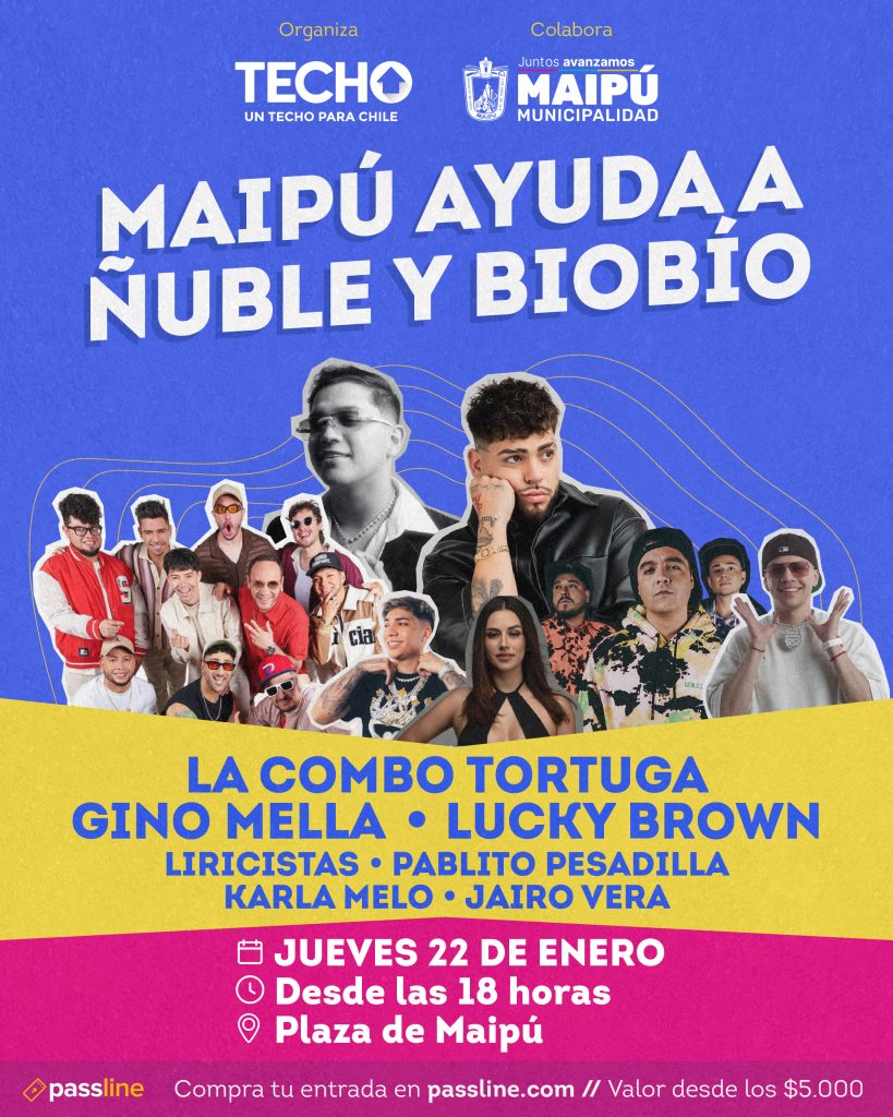 El show, organizado por Techo Chile en colaboración con la Municipalidad de Maipú, contará con la presencia de La Combo Tortuga, Pablito Pesadilla, Karla Melo, Lucky Brown, Liricistas y Gino Mella.