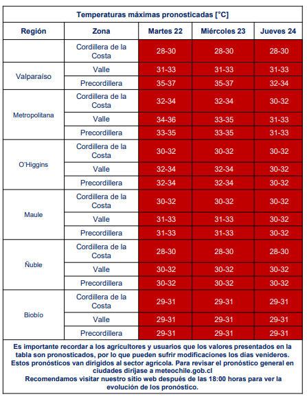 La Dirección Meteorológica de Chile emitió una advertencia agrometeorológica vigente desde el martes hasta el jueves 24 de noviembre debido a las altas temperaturas pronosticadas entre las regiones de Valparaíso y Biobío.