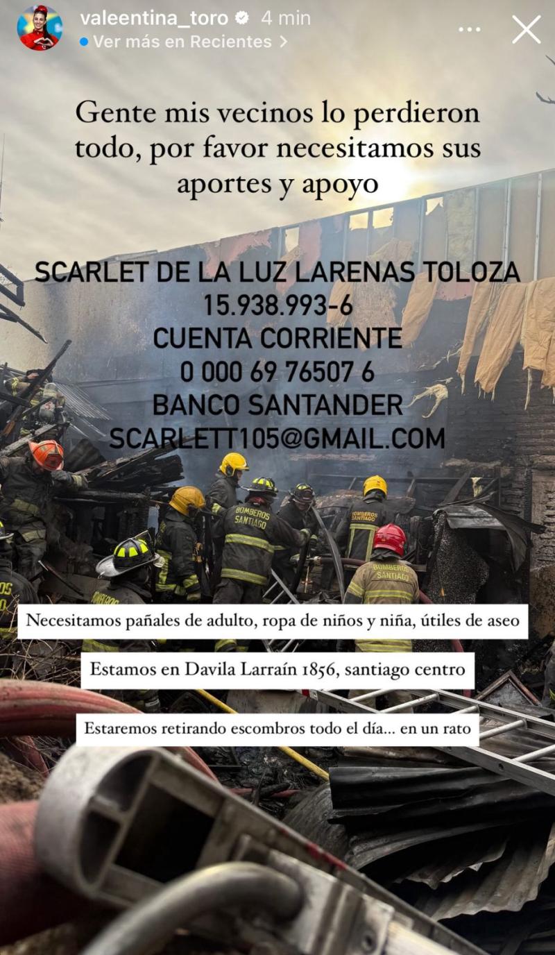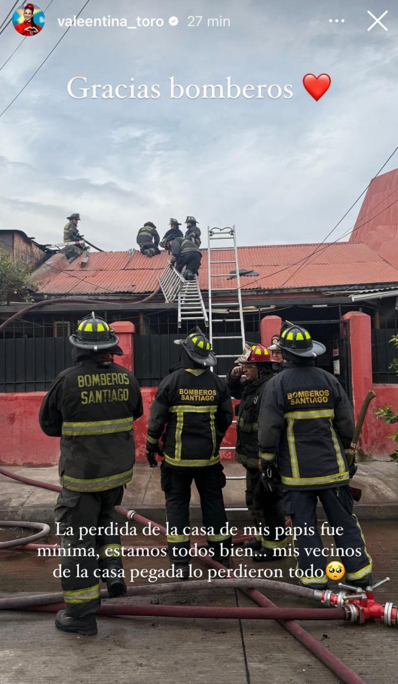 Toro también relató que recibió el llamado de sus padres cuando ocurrió el incendio en Santiago, por lo que acudió rápidamente al lugar. “Corrí de allá para acá, empecé a llamar a mis amigas vecinas para que vinieran a ver a mis papás, así que estamos bien”, añadió.