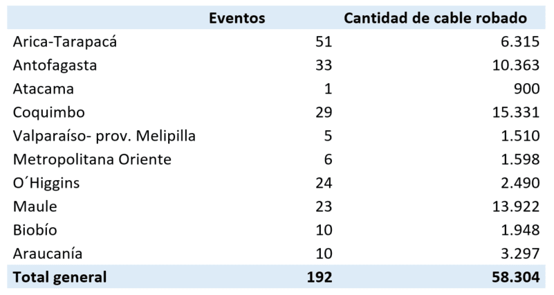 Esto equivale a más de nueve toneladas de cobre robado por bandas delictuales, lo que también provocó que 88.839 clientes vieran interrumpido su suministro eléctrico producto de la acción de estos delincuentes.