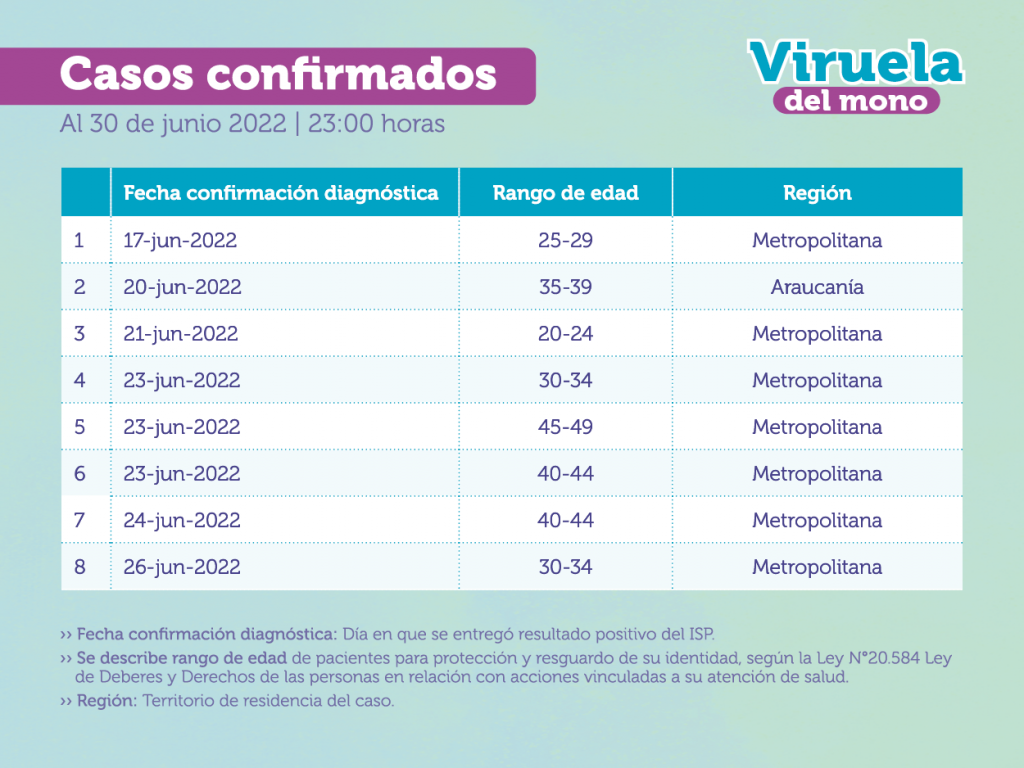 En este sentido, la entidad confirmó que al 30 de junio de este año se registran 8 casos de viruela del mono en el país y detalló que 28 han sido descartados.
