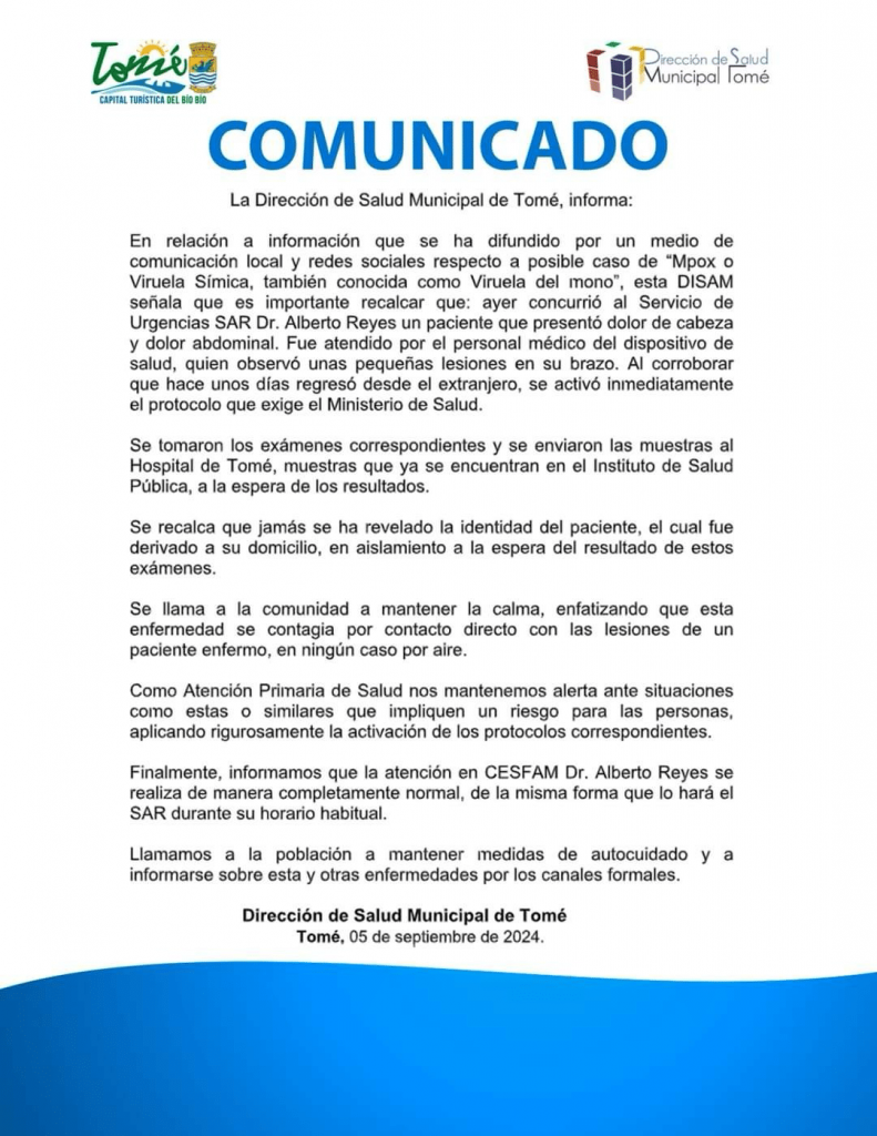 Este jueves la Dirección de Salud Municipal de Tomé informó que activó el protocolo por un posible caso de viruela del mono en la localidad de la región del Biobío.