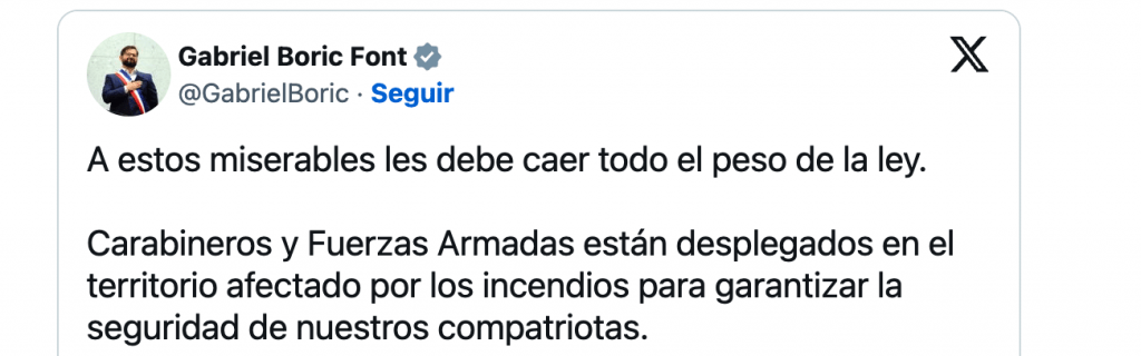 “A estos miserables les debe caer todo el peso de la ley. Carabineros y Fuerzas Armadas están desplegados en el territorio afectado por los incendios para garantizar la seguridad de nuestros compatriotas”, señaló.
